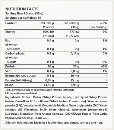 protein isolate with 250 ml water or skimmed milk to prepare your delicious protein